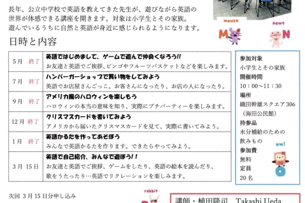 長年、公立中学校で英語を教えてきた先生が、遊びながら英語の世界が体感できる講座を …